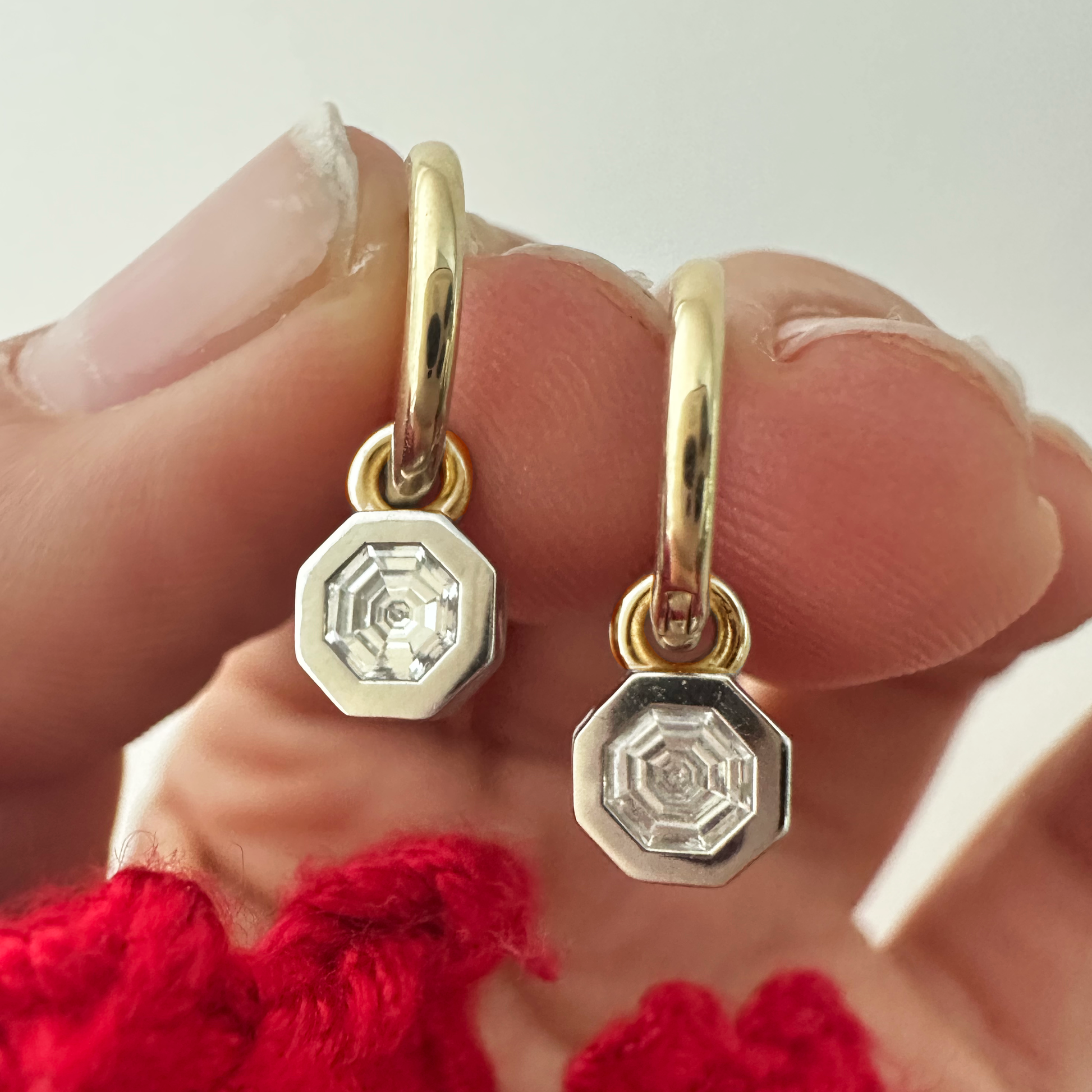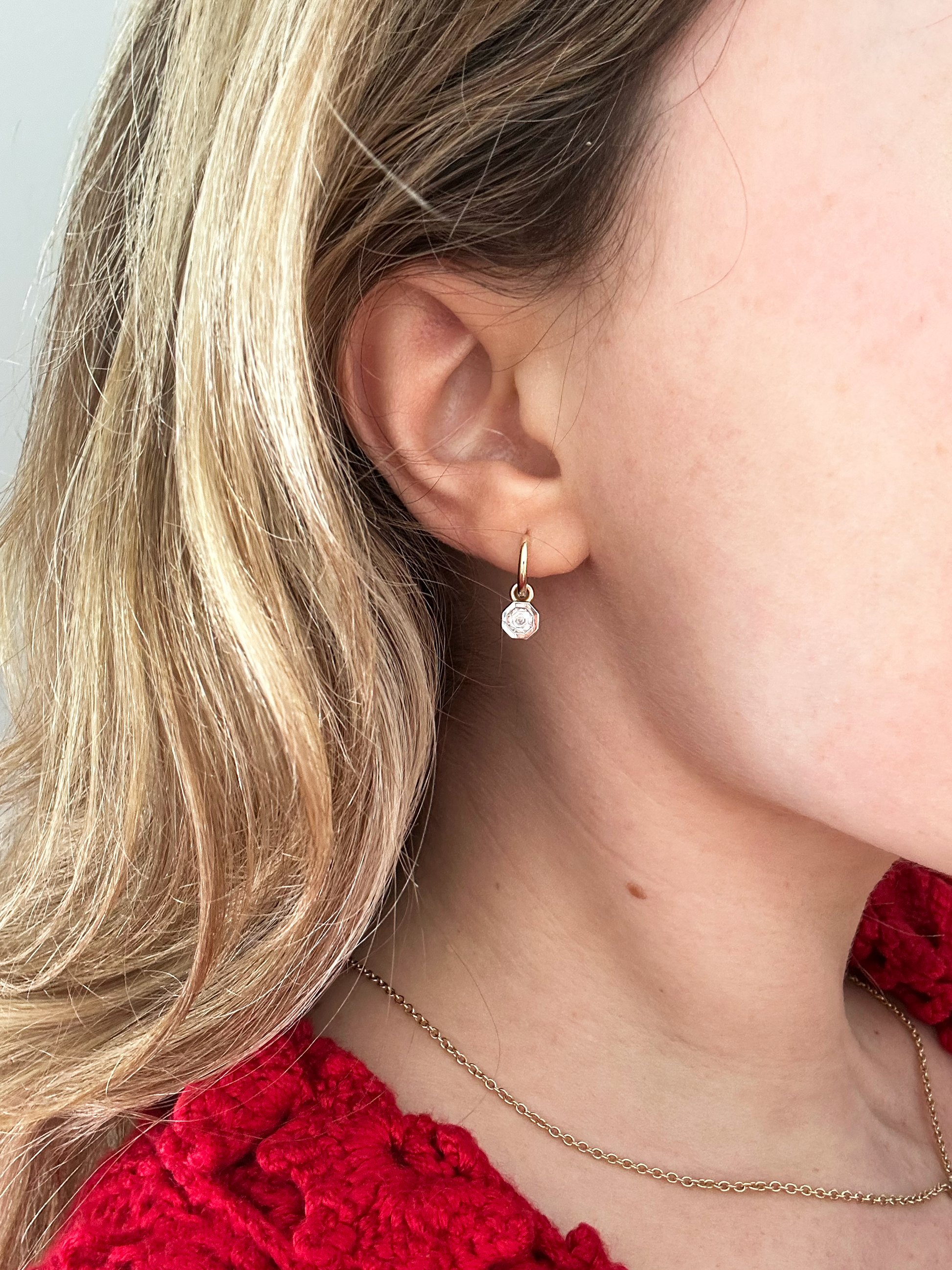 A modern essential with an Art Deco edge. These mixed-metal huggies have octagon diamond drops, set in a delicate bezel. The perfect addition to your everyday uniform.